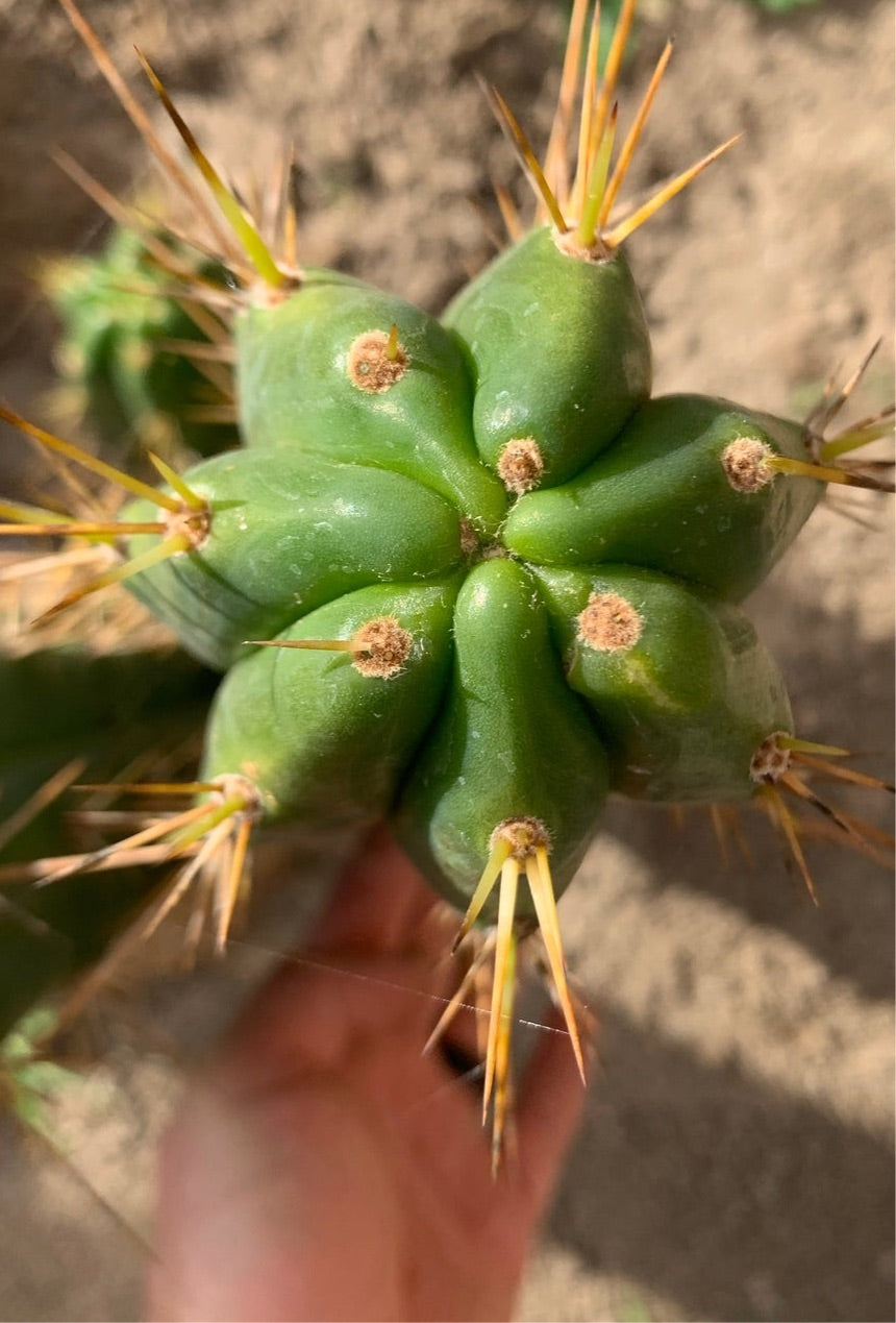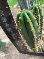 Psycho0’ x SS01 (Bridgesii x Peruvianus) . I love the yellow spines against dark green on this one. 12” pup to be cut upon purchase. .