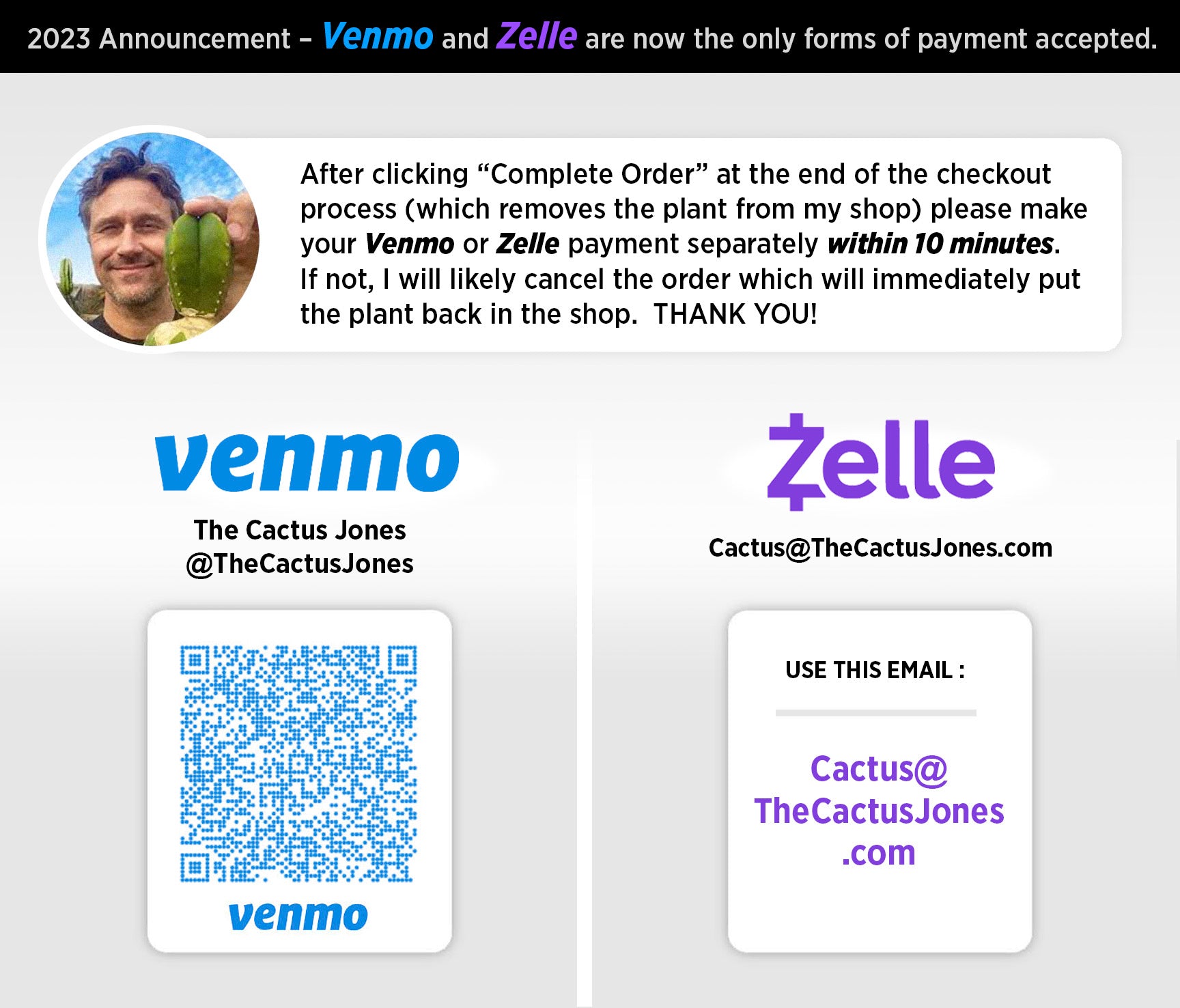 The cactus you see here is the same cactus you get. I only sell healthy cactus, but there’s always a chance of minor blemishes, marks, black stress blisters, scars and imperfections. All plants are hard grown rough-n-tumble without