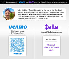 This plant requires protection from freezing weather. The Cactus Jones ships from a warm climate zone (no freezing), but please be aware of the temps on your end — will not refund for temperature related damage, whether frozen or cooked.
