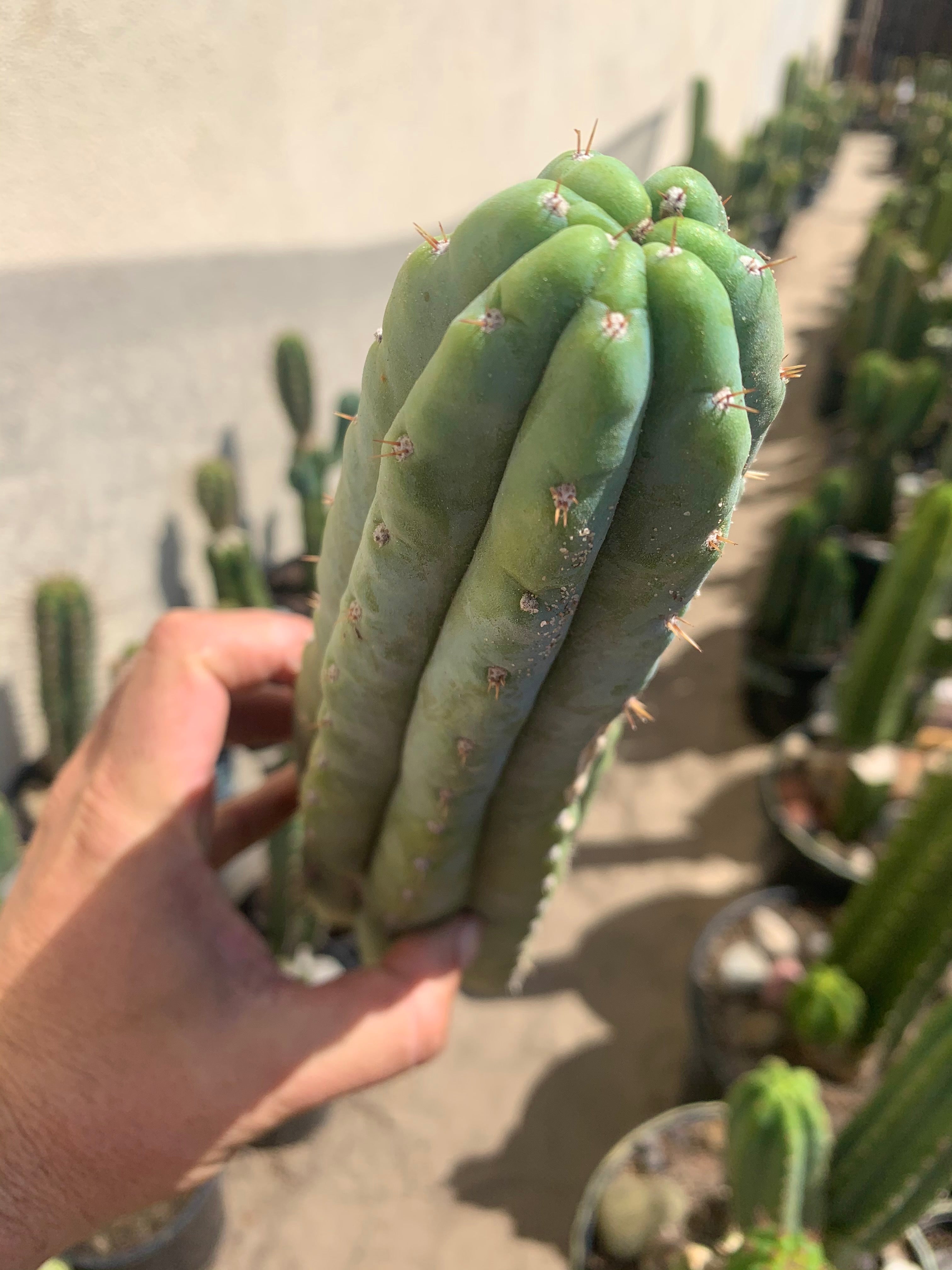 When grown in partial shade, this san pedro is some of the bluest pachanoi we’ve ever seen. Due to the Mother stand being found in Ventura and its smurfy blue skin, we’ve named it Ventucky Blue. If grown in full blaze sun, the blue may diminish, but it still remain bluer than the vast majority of Pachanoi species. This also has extra potential to segment (stack), even if the cutting listed shows no sign of this segmentation.
